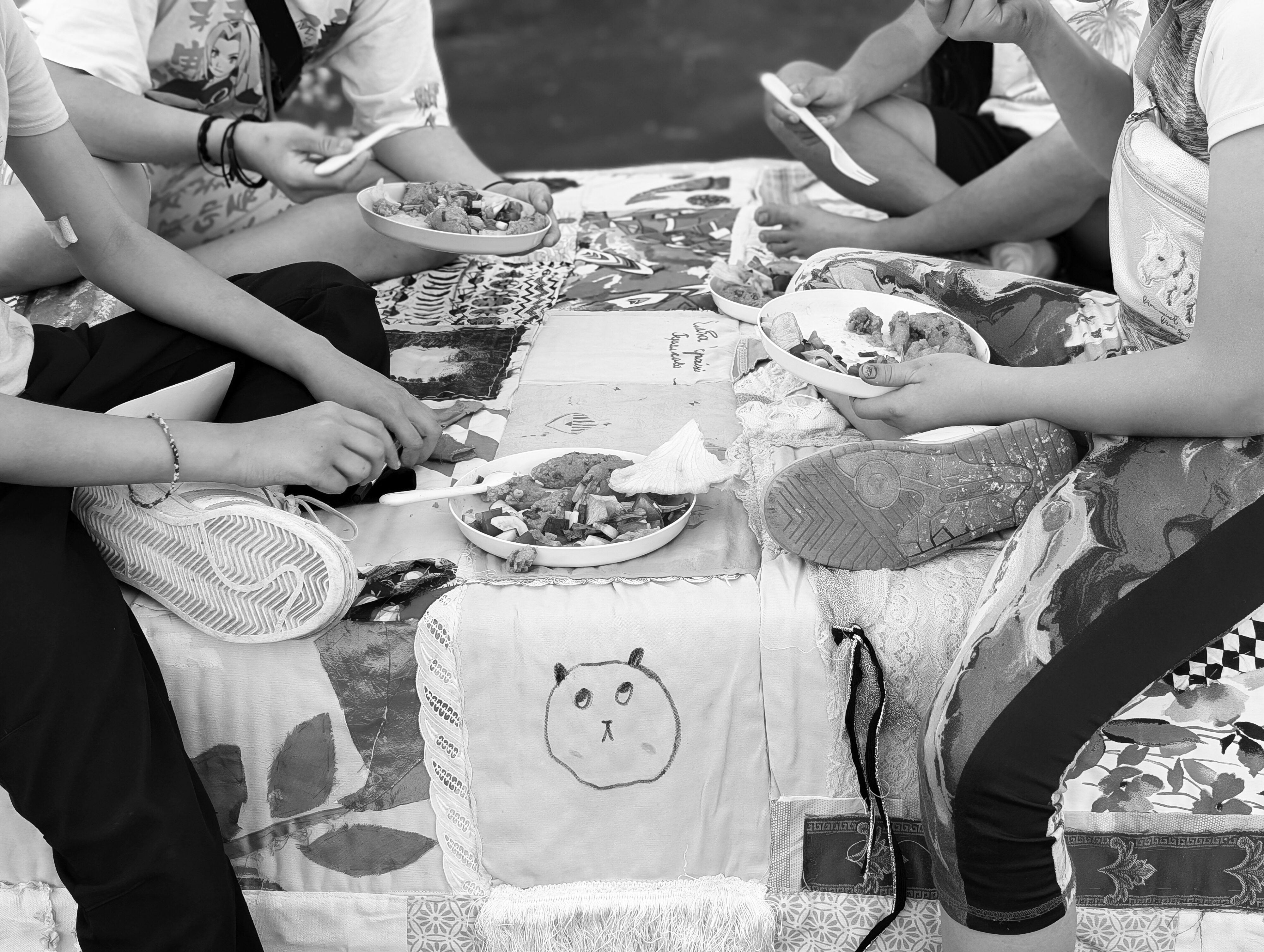 The joint revitalisation of the unbuilt space was a special part of the process. We arranged activities to make the concepts and ideas tangible, including readings, weaving a community carpet out of old clothes with the residents, dyeing fabrics, and creating the atmosphere of the future space together. These activities blurred the boundaries between the imagined and the real and allowed us not only to plan the space, but also to bring it to life in its imagined form.