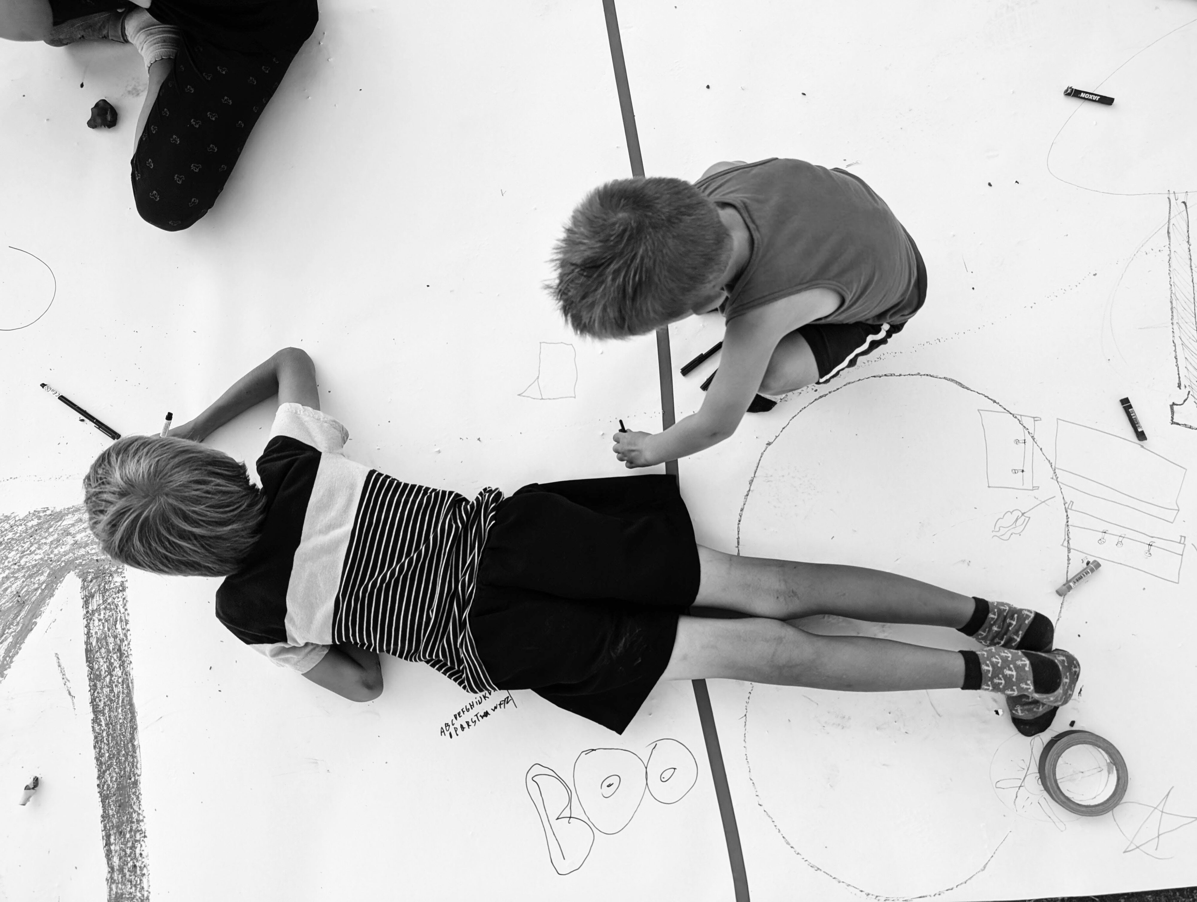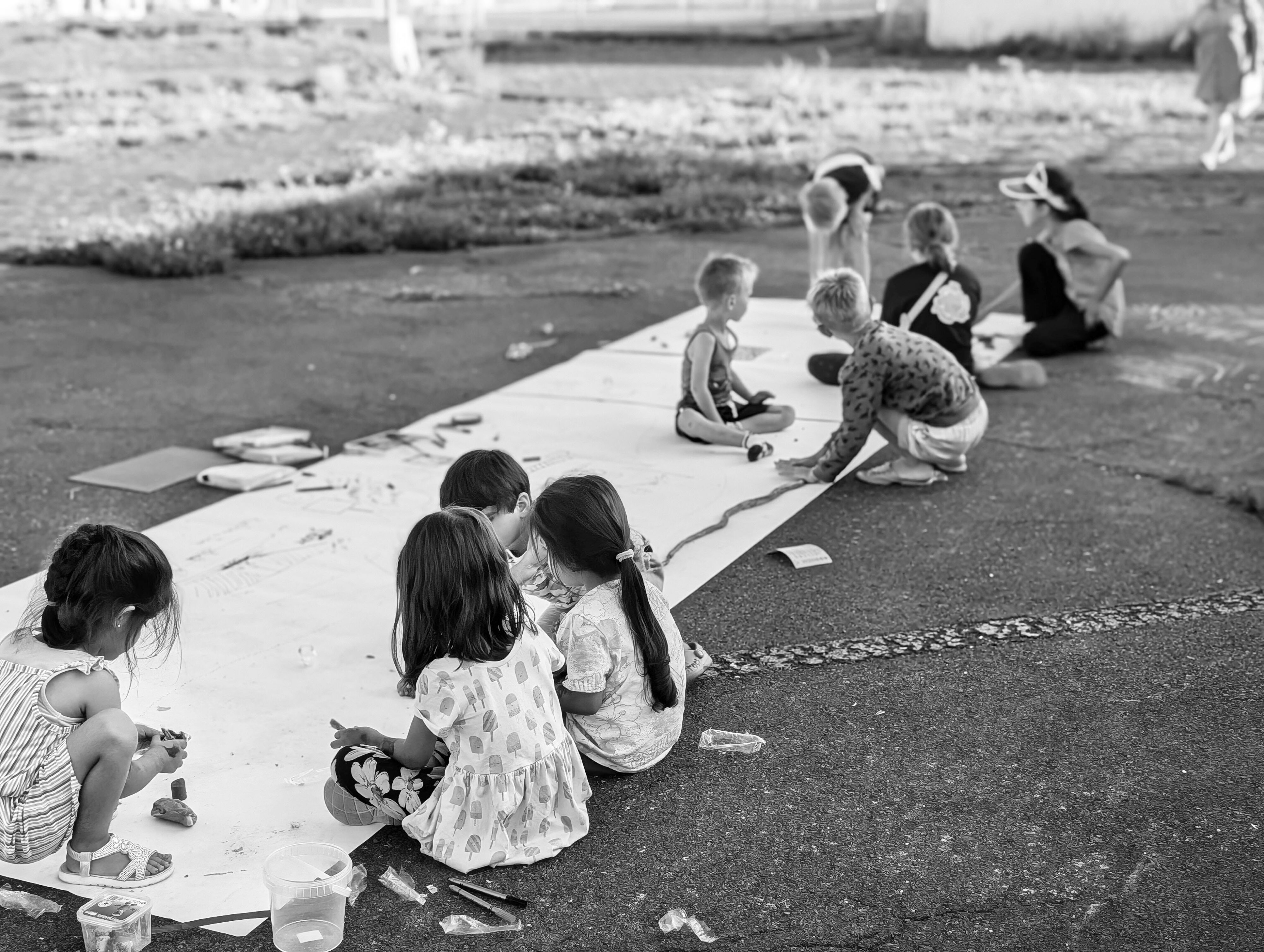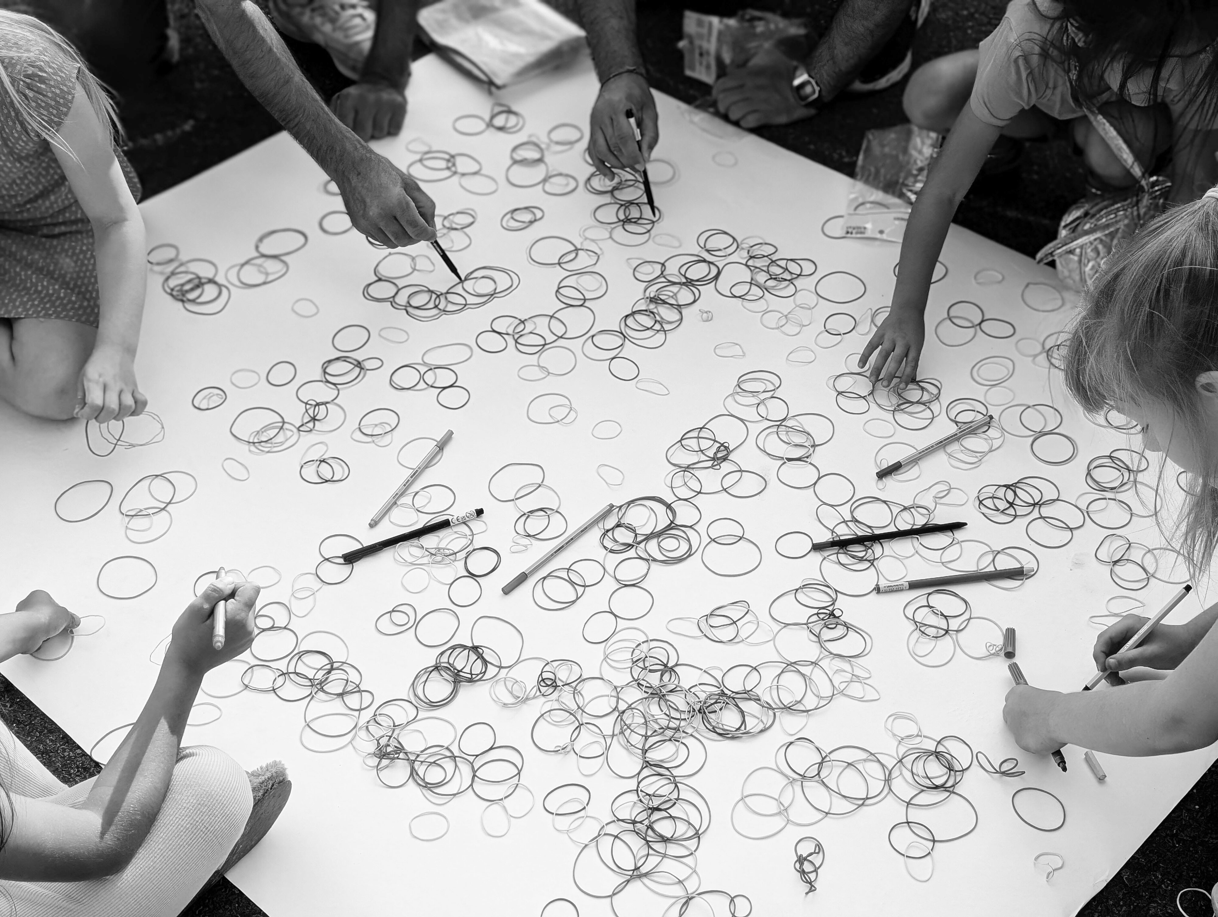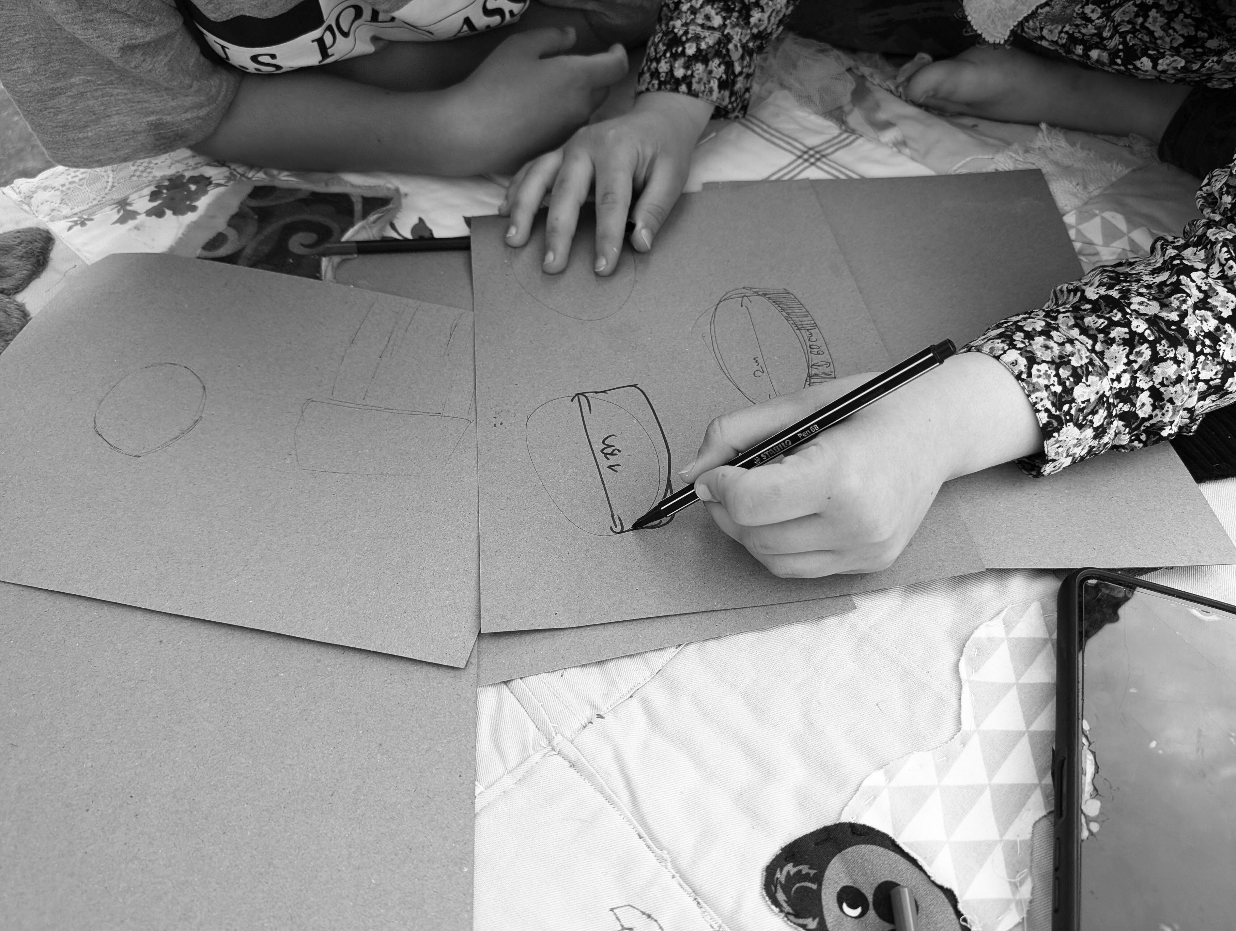 The space was also physically experienced as we engaged in activities such as play, running, and movement within it to infuse it with energy and explore its potential as a site for gatherings. Adults thought about places to rest and meet, while children and young people brought ideas about opportunities for their active games. The outcome was an interplay between physical experience and creative reflection.
