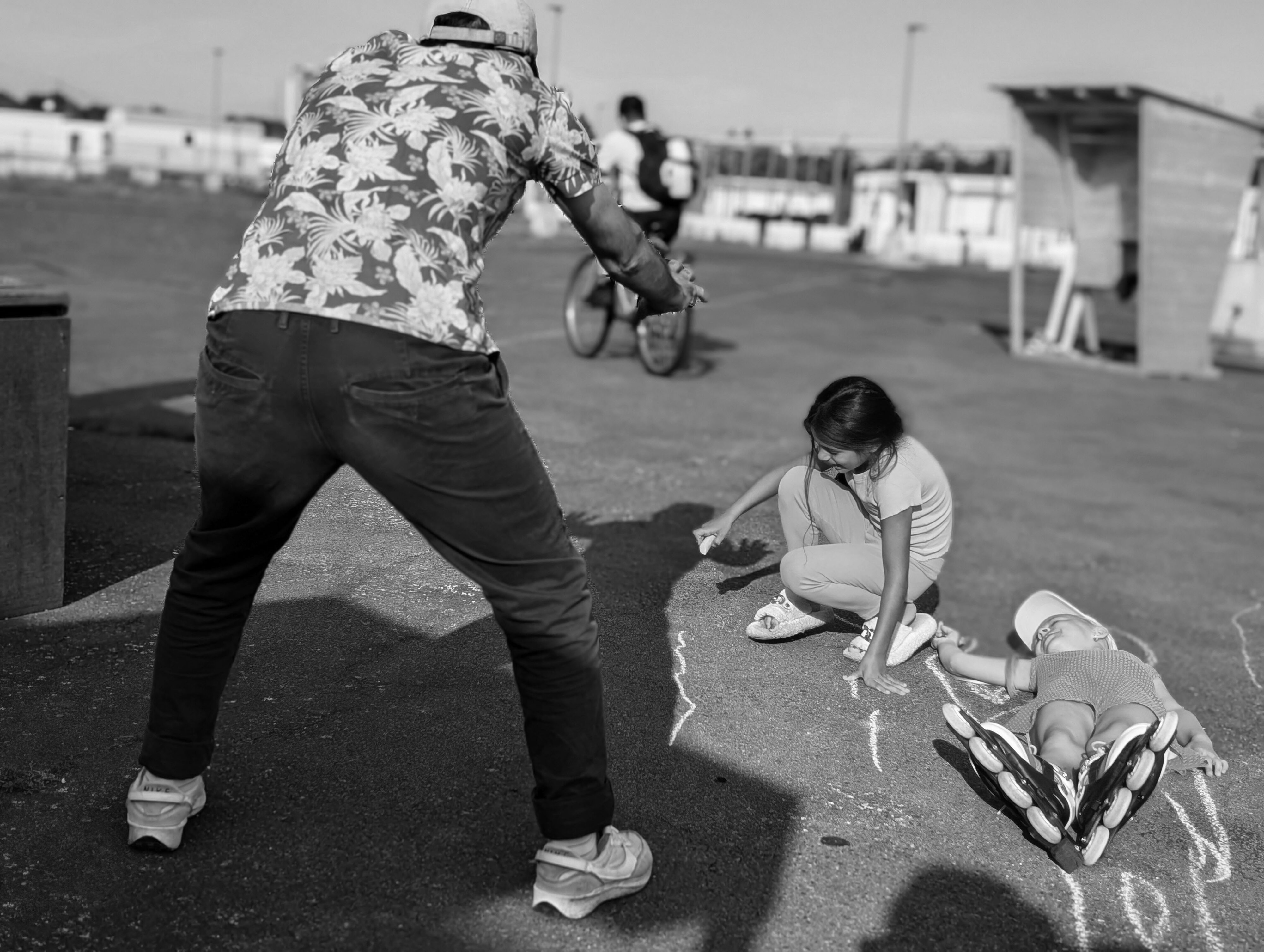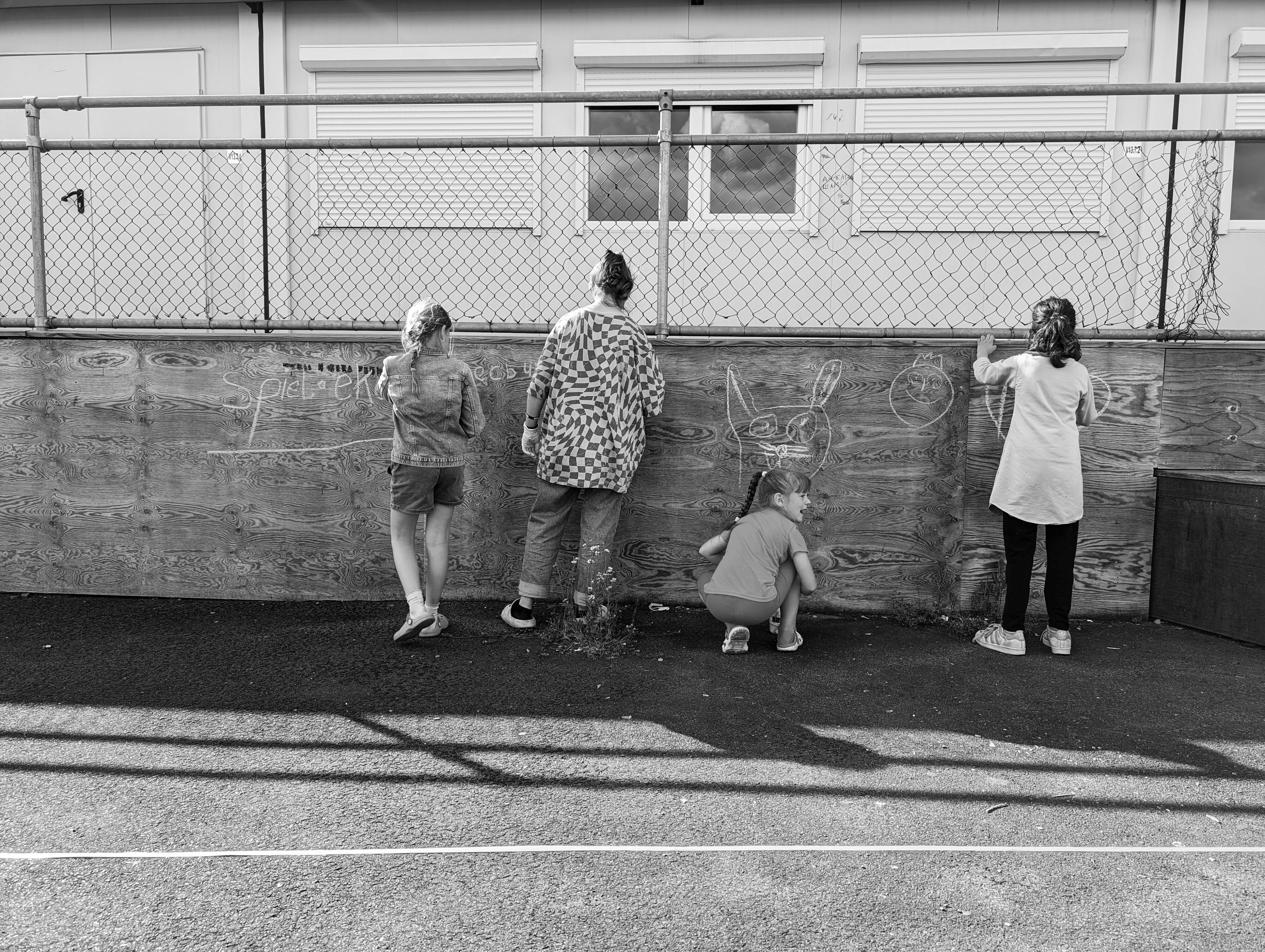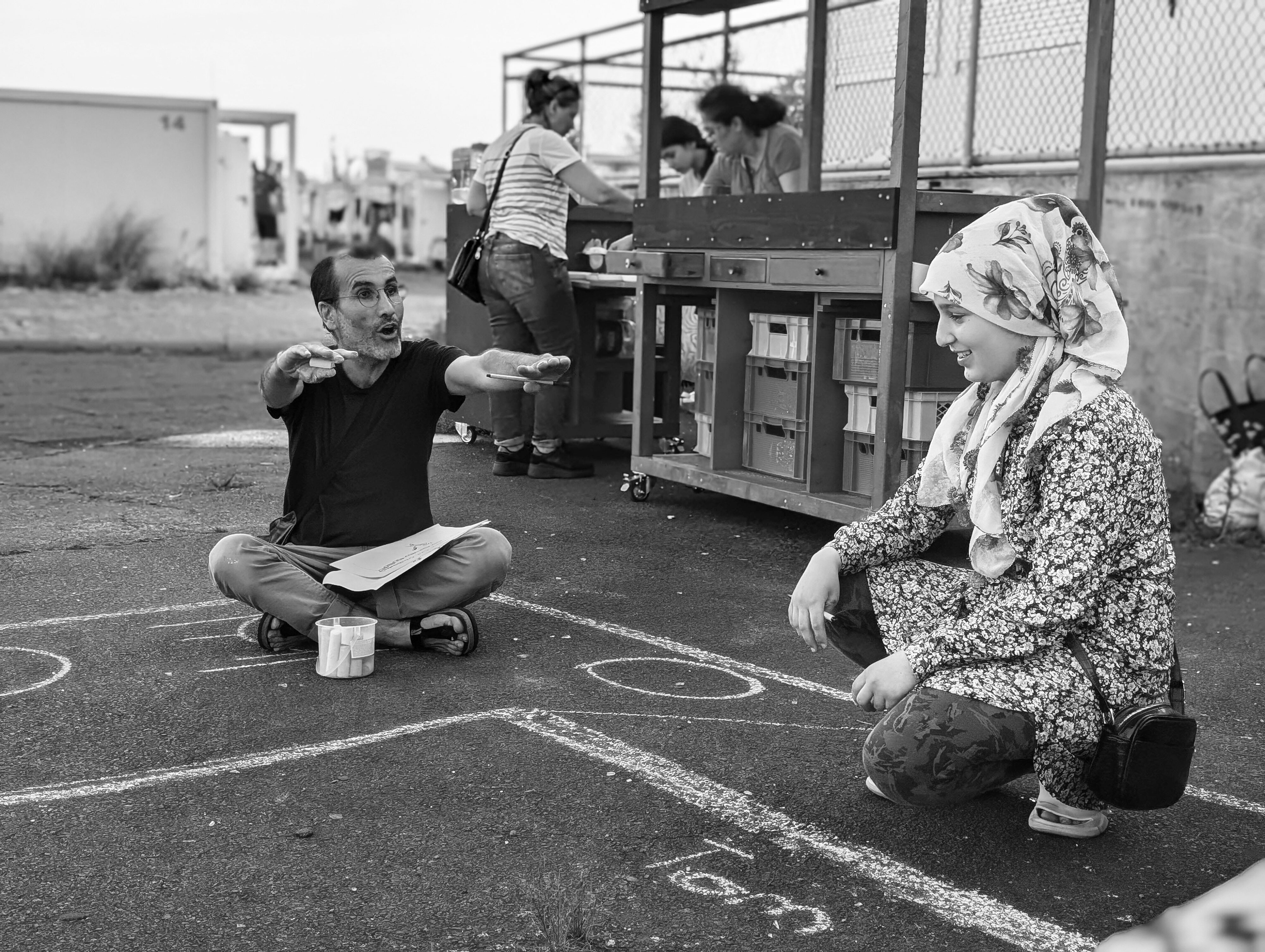 During a conversation with two young women, one belonging to a Kurdish family from Rania (ڕانیە) in Kurdistan-Iraq and the other from Northern Kurdistan in Turkey, a particularly lively moment transpired in the process. They came up with an idea to make a stage for children to play on. ‘Where should this stage be?’ I asked. The answer was firm and clear: ‘In the middle of the square.’ After that, we proceeded to flesh out our concepts, initially by utilizing coloured chalk drawings. Together, we determined the size of the stage and what it would need. The two women drew the initial sketch on the asphalt, took measurements, and assisted us in visualizing the location of the stage, which would serve as both a theatre and a playground.