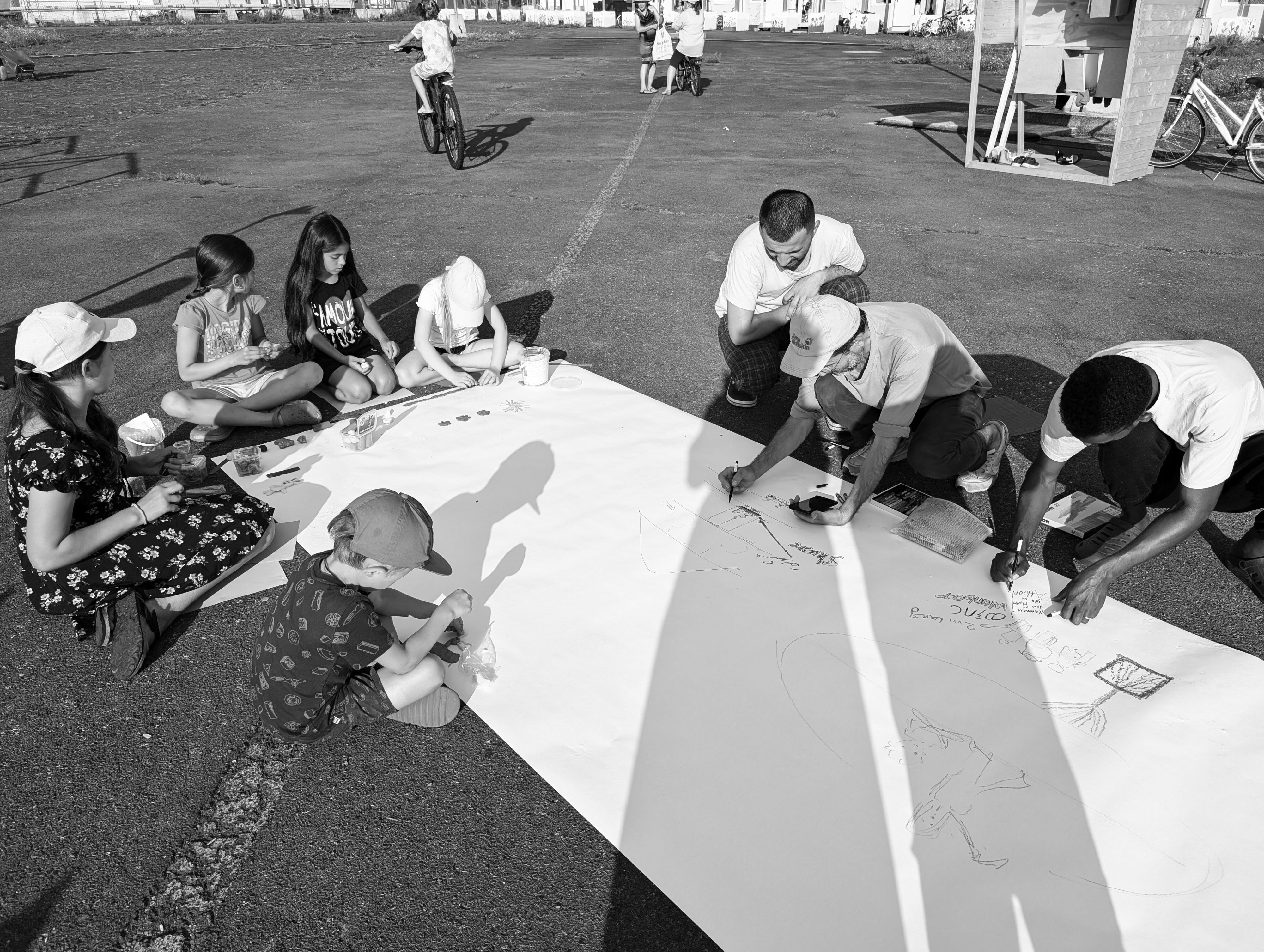 The construction process was very dynamic. Residence of all generations took part, regardless of whether they shared a common language. Communication was often non-verbal, such as through gestures, working together, and showing ideas. There was a constant flow of residents as some stopped by to observe the process, while others came back to work for extended periods. Everyone contributed in their own way.
